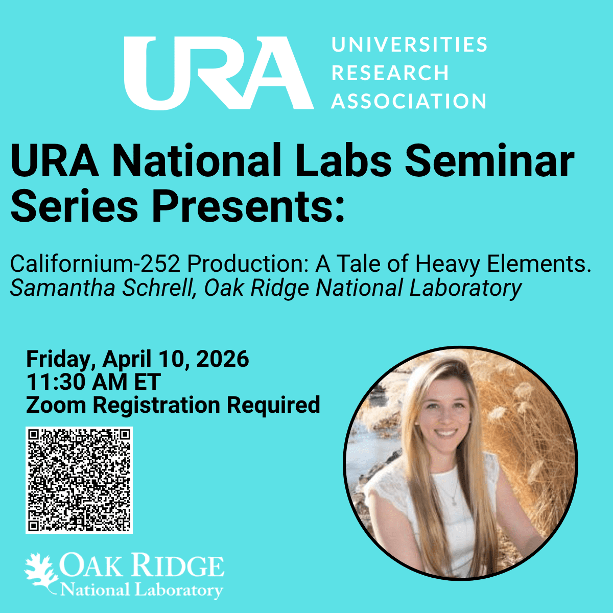 The Universities Research Association National Labs Seminar Series will feature Dr. Samantha Schrell from Oak Ridge National Laboratory. Her talk, Californium-252 Production: A Tale of Heavy Elements, will discuss the history of heavy-element production, focusing on Cf-252, a key isotope in today’s nuclear renaissance. She will also highlight opportunities at ORNL for both students and staff members.